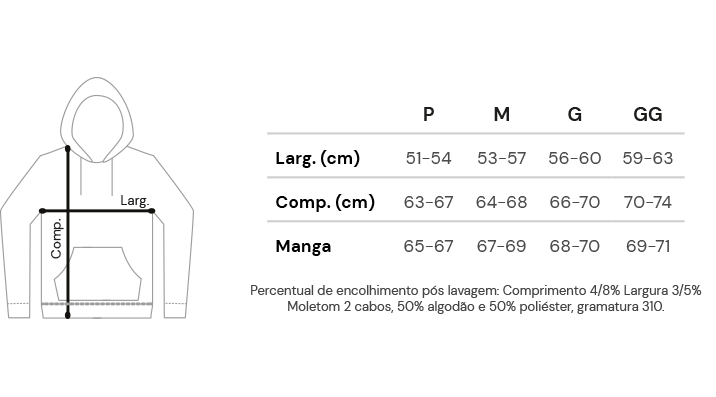 O punho e a barra em retilínea deixam o ajuste mais bonito no corpo e dão à peça um acabamento mais valorizado. Produzido em moletom 2 cabos com gramatura 310 garante uma estrutura mais encorpada, com qualidade superior e mais presença no visual.